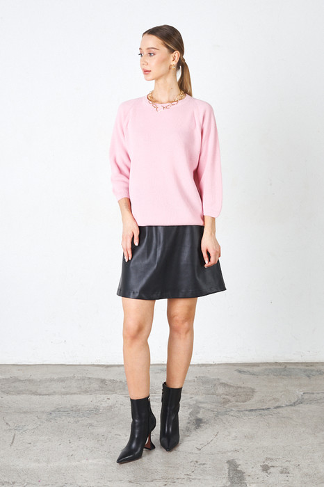 Юбка-мини из эластичного полотна, с покрытием, имитирующим кожу, расширенная книзу. Сзади по среднему шву застёжка-молния. Изделие без пояса, верхний срез обработан обтачкой. В таблице размеров представлены параметры человека, а не изделия.