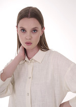 Блуза-рубашка свободного силуэта с застёжкой на пуговицы из вискозной ткани. Низ изделия с закруглениями по бокам. Втачной рукав в спущенную пройму. Вырез горловины обработан отложным воротником на стойке. На задней части изделия выполнена кокетка с небольшой складкой. Достоинство этой модели - в способности скрыть некоторые недостатки фигуры.