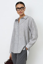 Блуза свободного силуэта из вискозной ткани. Втачной рукав на высокой манжете с застёжкой на пуговицы. Круглый вырез горловины обработан косой бейкой. По среднему шву спинки застёжка на петлю-пуговицу.
