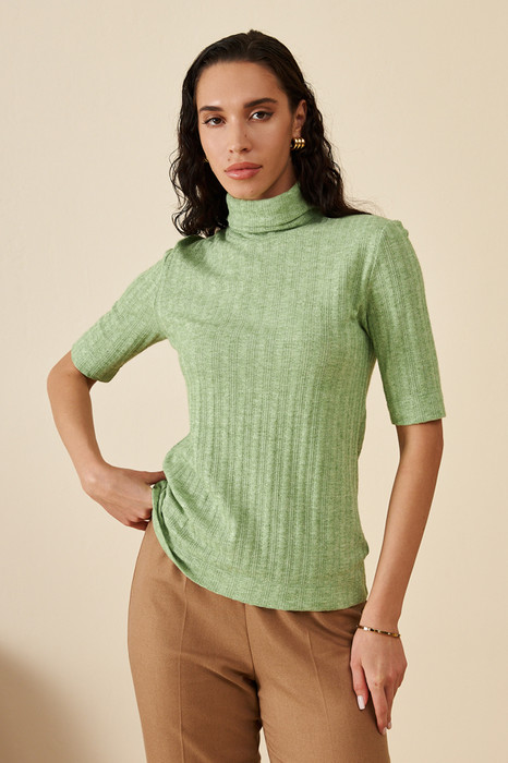 Джемпер прилегающего силуэта из фактурного эластичного полотна. Втачной короткий рукав. Вырез горловины высокая стойка. Джемпер – это хорошая базовая вещь, подходящая для любого гардероба.