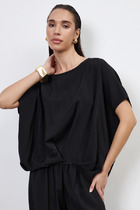 Костюм из атласной плательно-блузочной ткани. Блуза свободного силуэта с английским воротником. Английский воротник визуально сделает фигуру стройнее, скроет недостатки и подчеркнет красивую линию груди. На передней части изделия застежка на пуговицы. Втачной длинный рукав. Брюки прямого силуэта,.в боковых швах карманы. Пояс притачной с эластичной резиной.