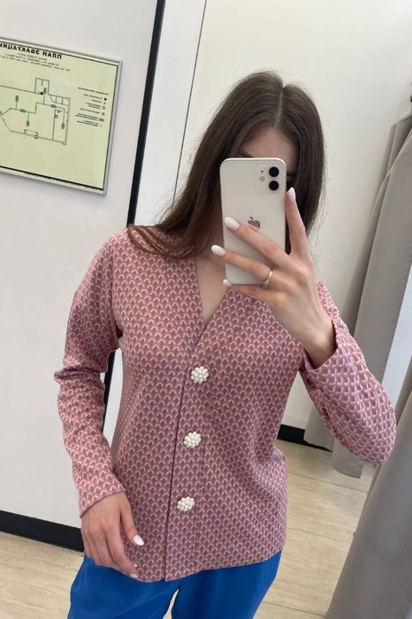 Кардиган свободного силуэта из эластичного полотна. Втачной длинный рукав в спущенную пройму. Линия борта обработана притачной планкой с застёжкой на пуговицы.