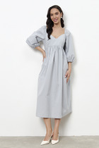 Платье свободного силуэта из плательной ткани. По центру передней части изделия выполнен шов. Цельнокроеная стойка, переходящая в V-образный вырез горловины, визуально делает фигуру стройнее. Втачной короткий рукав.