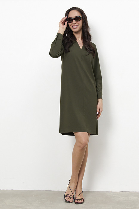 Платье свободного силуэта из плательной ткани. По центру передней части изделия выполнен шов. Цельнокроеная стойка, переходящая в V-образный вырез горловины, визуально делает фигуру стройнее. Втачной длинный рукав. Низ рукава на манжете с застёжкой на пуговицы-жемчужины.