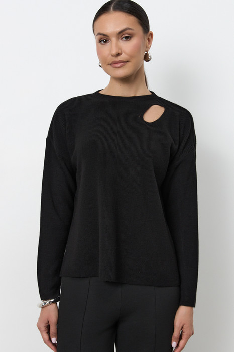 Джемпер свободного силуэта с декоративным вырезом в области плеча. Рукав втачной в спущенную пройму. Изделие выполнено из мягкой структурированной пряжи.