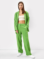 Костюм выполнен из эластичных тканей компаньонов. Брюки прямого силуэта. Пояс притачной с эластичной резиной. На передней части брюк застрочены стрелки. Жакет прямого свободного кроя с женственным шалевым воротником. На передней части изделия накладные карманы. Втачной рукав. Изделие с плечевыми накладками, которые при желании можно убрать. В комплекте пояс из основной ткани.