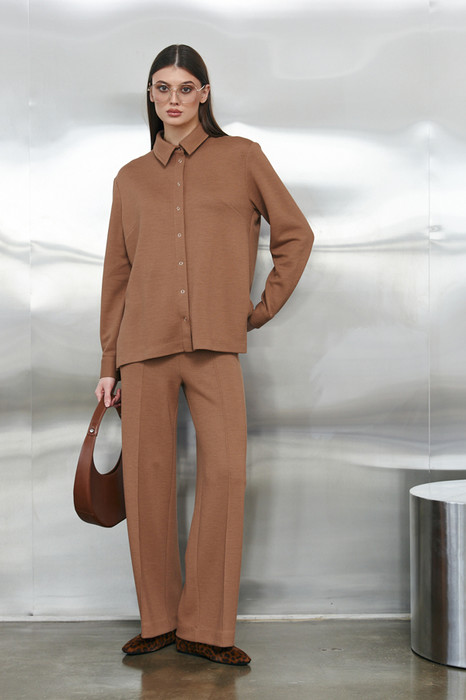 Брюки прямого силуэта из эластичного полотна. Пояс притачной с эластичной резиной. На передней части брюк застрочены стрелки.