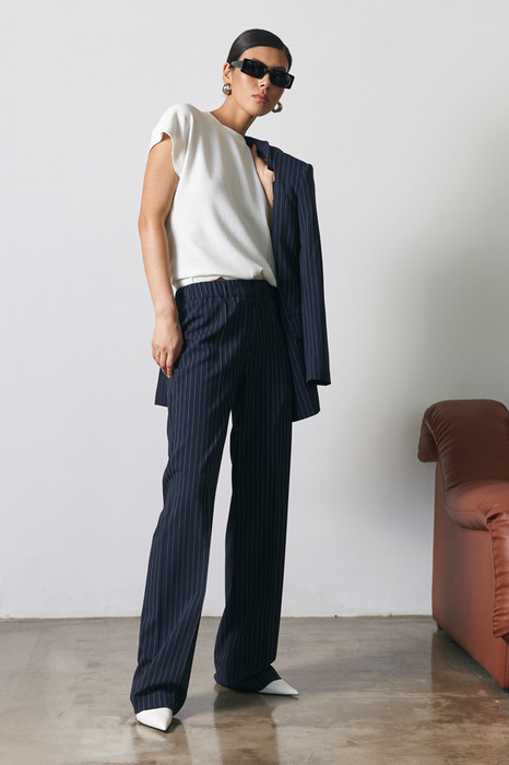 Брюки прямого силуэта из костюмной ткани. Пояс притачной с эластичной резиной.