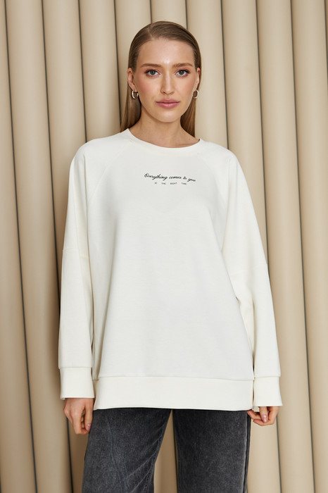 Свитшот свободного силуэта из эластичного полотна. Круглый вырез горловины оформлен бейкой. Рукав реглан с горизонтальным швом в области локтевого сгиба. По низу изделия и рукавов выполнены притачной пояс и манжеты из основной ткани. В таблице размеров представлены параметры человека, а не изделия.