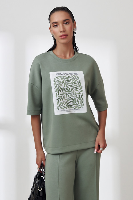Джемпер свободного силуэта со спущенной линией плеча и рукавом до локтя выполнен из эластичного полотна. Вырез горловины оформлен бейкой из основной ткани. На передней части изделия выполнена аппликация. В таблице размеров представлены параметры человека, а не изделия.