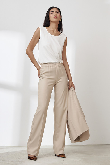 Брюки прямого силуэта из костюмной ткани. Пояс притачной с эластичной резиной.