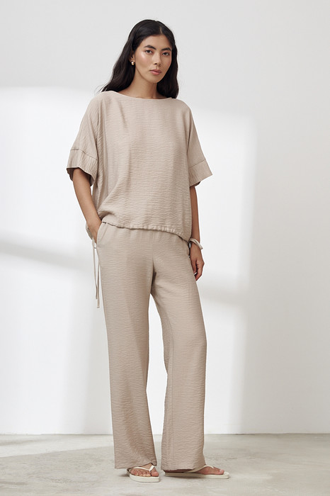 Брюки прямого силуэта из вискозной ткани с крэш-эффектом. Пояс с эластичной резиной и кулиской, в боковых швах карманы.
