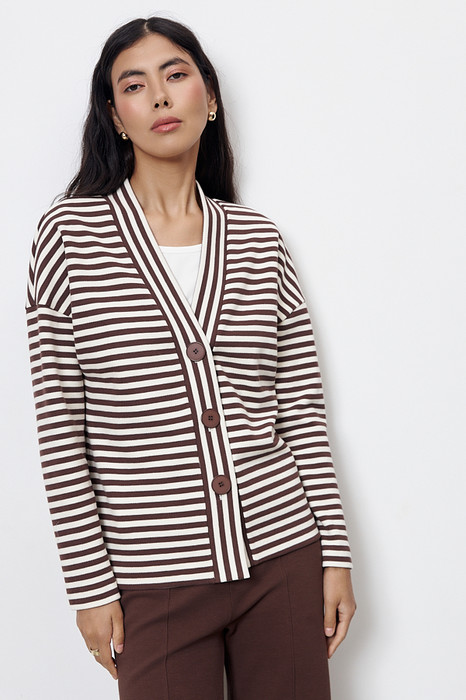 Кардиган из эластичного полотна свободного силуэта. Втачной длинный рукав в спущенную пройму. Линия борта обработана притачной планкой с застёжкой на пуговицы.