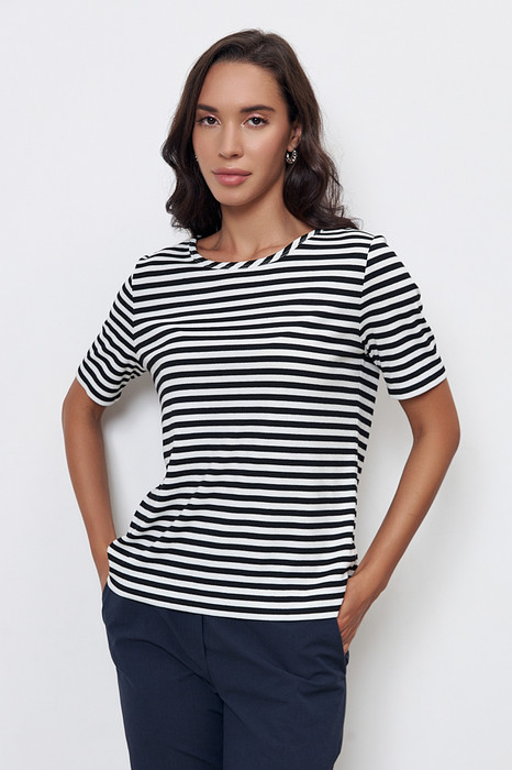 Джемпер из эластичного полотна полуприлегающего силуэта. Втачной короткий рукав. Вырез горловины окантован эластичной бейкой. Джемпер – это хорошая базовая вещь, подходящая для любого гардероба.