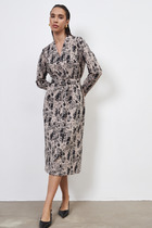 Платье из вискозной ткани с крэш-эффектом полуприлегающего силуэта. По центру передней части изделия выполнен шов, снизу разрез. V-образный вырез горловины и линия проймы оформлены косыми бейками.