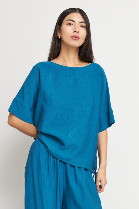 Блуза из вискозной ткани с крэш-эффектом. Очень свободный силуэт с небольшими разрезами по бокам. Круглый вырез горловины. Цельнокроеный рукав с притачной манжетой. Низ изделия затягивается на кулиску.