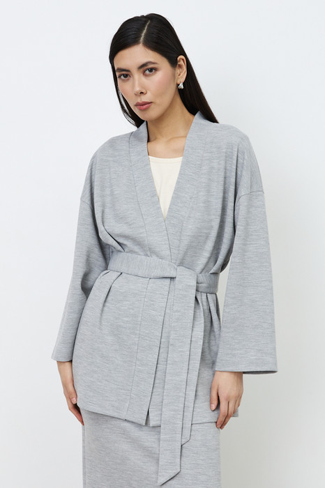 Кардиган из меланжевого эластичного полотна. Свободный силуэт с притачной планкой. Втачной широкий рукав в спущенную пройму. В комплекте пояс, позволяющий создавать приталенный силуэт.