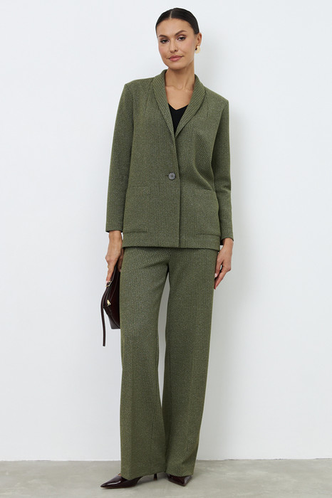 Костюм из эластичного полотна. Брюки прямого силуэта. Пояс с эластичной резиной. Жакет прямого свободного кроя с женственным шалевым воротником. На передней части изделия застёжка на пуговицу и накладные карманы. Втачной рукав. Изделие с плечевыми накладками, которые при желании можно убрать.