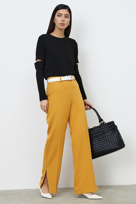 Брюки из костюмной ткани прямого силуэта с разрезами в боковых швах. Застёжка на молнию-гульфик и пуговицу. Притачной пояс со шлёвками. Задняя часть пояса с резиной, что обеспечивает хорошую посадку по фигуре.