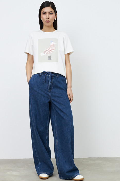 Брюки из денима выполнены по классической джинсовой технологии (варка с эффектом легкого выбеливания). Прямой широкий крой. На задней части брюк выполнены накладные карманы, на передней - карманы с подкройным бочком. Притачной пояс со шлёвками и кулиской. Застёжка на молнию-гульфик и пуговицу.