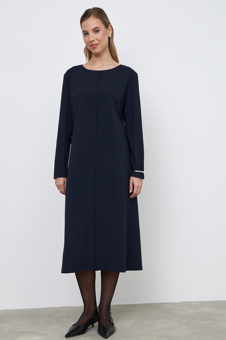 Платье из плательной ткани полуприлегающего силуэта, расширенное книзу. По центу передней части изделия и рукавов выполнена застрочка. Втачной длинный рукав. Круглый вырез горловины, сзади застёжка на петлю-пуговицу.