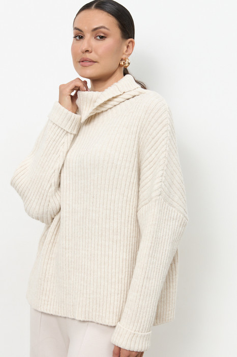 Джемпер свободного силуэта со спущенной линией плеча и длинным рукавом. Линия горловины оформлена высокой стойкой. Изделие выполнено из мягкой пряжи.