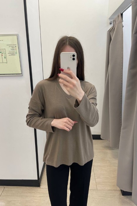 Джемпер из эластичного полотна в мелкий рубчик свободного силуэта. V-образный вырез горловины оформлен бейкой. Длинный рукав в спущенную пройму. Женский джемпер стал незаменимой и популярной разновидностью одежды, которая может применяться буквально во всех случаях жизни.