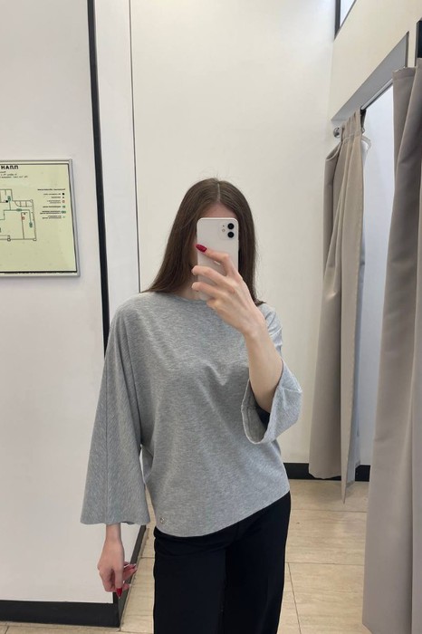 Джемпер из меланжевого эластичного полотна свободного силуэта. Цельнокроеный длинный рукав в стиле кимоно. Круглый вырез горловины окантован эластичной бейкой. В таблице размеров представлены параметры человека, а не изделия.