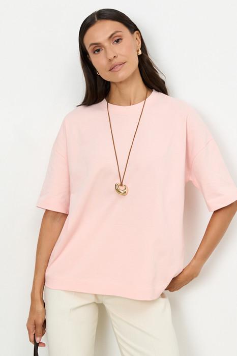 Джемпер из эластичного полотна. Свободный силуэт со спущенной линией плеча и рукавом до локтя. Вырез горловины оформлен бейкой. В таблице размеров представлены параметры человека, а не изделия.