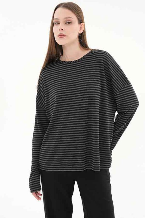 Джемпер из эластичного полотна. Свободный силуэт со спущенной линией плеча и длинным рукавом. Круглый вырез горловины окантован эластичной бейкой. В таблице размеров представлены параметры человека, а не изделия.