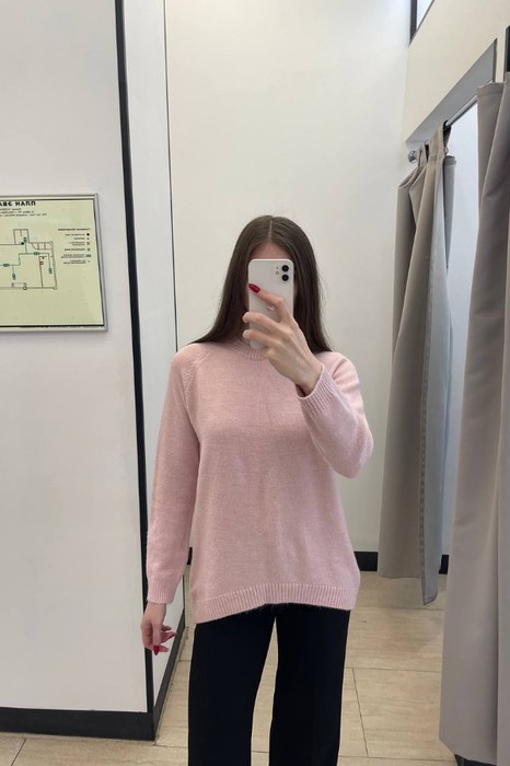 Джемпер свободного силуэта. Низ изделия асимметричной длины (спинка удлинена относительно переда). Длинный рукав-реглан. Круглый вырез горловины, низ изделия и низ рукава оформлены резинкой. Изделие выполнено из мягкой пряжи.