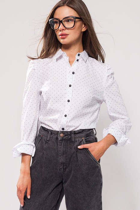 Состав: 62%Хлопок 38%ПЭБлузка из хлопка с полиэстером. Полиэстер сохраняет гладкость и формоустойчивость ткани, делает ткань проще в уходе. Главным элементом блузки являются трендовые защипы по окатам рукава, которые становятся ведущим акцентом в любом луке. Особенный эффект сохдает игра мемлкого рисунка ткани с контрастными пуговицами блузки.