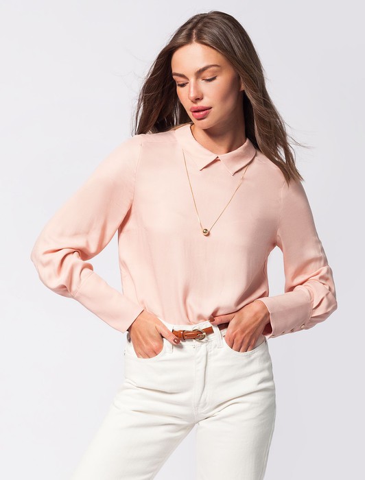 Состав: 100%ВисБлузка прямого силуэта. Застежка на воротнике сзади. Украшена высокими манжетами с рядом золотистых пуговиц. Плетение вискозы в рубчик придает ткани плотнсти и благородного блеска.
