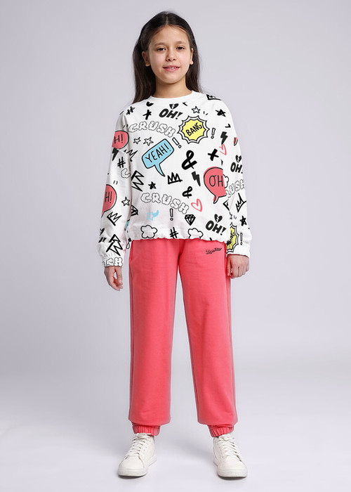 Брюки из футера среднего объема, 100% хлопок. Пояс и низ брюк - на резинке, карманы в боковом шве. Впереди принт.