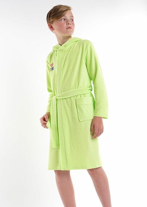 Халат для мальчика с капюшоном и на запах, фиксируется широким поясом на талии и пуговицей с петлей по горловине. Сбоку накладной карман. Выполнен из махры 80%Хлопок20%ПЭ. Украшен небольшой вышивкой.
