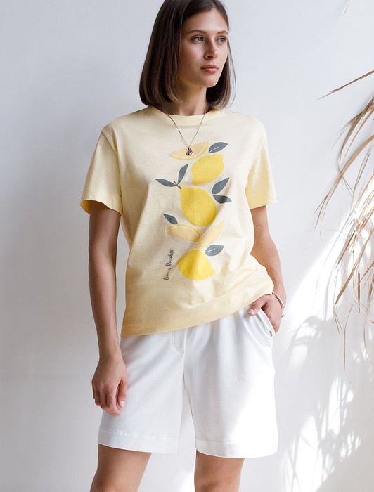 Состав: 100%Хлопок Параметры модели на первом фото: Рост 170, бюст 89, талия 63, бедра 92Перевод принта: Lemon paradise - Лимонный рай.Футболка выполнена из фактурного полотна из 100% хлопка. Модель с лаконичным авторским принтом легко впишется в любой весенне-летний гардероб. Ткань имеет характерный рисунок черточки за счет сочетания разных волокон хлопка 140-150 г. Хорошо держит форму и поддерживает комфортный микроклимат в течении дня.