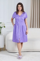 Халат женский из трикотажного полотна «кулирка» с набивным рисунком, расширенный книзу, с короткими цельнокроеными рукавами, отрезное по линии талии и присборенное по соединительному шву. На лифе выполнены рельефы. Изделие с V-образной горловиной, карманами в боковых швах и центральной бортовой застежкой на тесьму «молния».