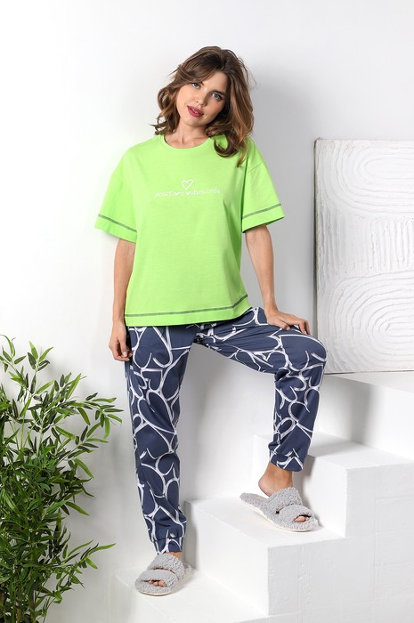 ниточной строчкой контрастными нитками.Брюки - из полотна с набивным рисунком, длинные, свободные, с карманами в боковых
