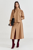 Блуза полуприлегающего силуэта, с втачным рукавом и нагрудной вытачкой из бокового шва. Низ блузы фигурный. Горловина округлой формы, окантована основной тканью.