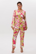 Жакет прямого силуэта, длиной ниже линии бедер. Рукава одношовные, втачные, длинные. По низу рукава «клеш». Воротник «шаль». Жакет без застежки со съемным поясом, без подкладки.