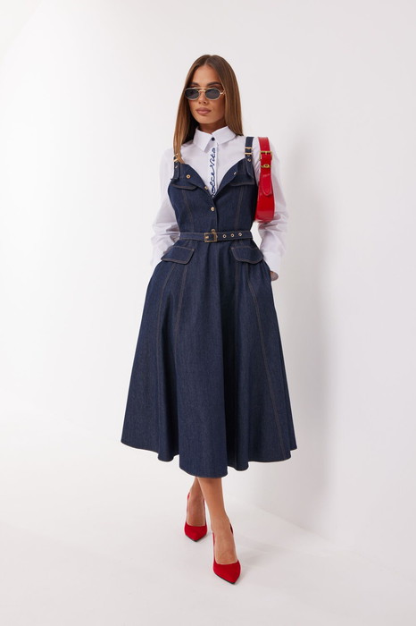 Платье с отрезной линией по талии из джинсовой ткани. Длина миди. Платье на регулируемых бретелях. Застёжка по переду на кнопки и по боку на потайную молнию. По переду клапаны на полочке и на юбке. По талии платье фиксируется съёмным  регулируемым поясом на пряжке.