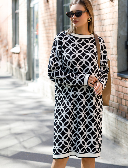 Состав: 50%Вис 20%ПА 20%ПЭ 10%Кашемир Параметры модели на первом фото: Рост 172, бюст 88, талия 64, бедра 88Платье жаккардовой вязки выполнено из мягкой пряжи на основе вискозы с добавлением кашемира. Модель свободного силуэта подходит для любой фигуры. Нежная пряжа очень комфортно ощущается на теле, сохраняя оптимальное тепло при этом не перегревая. Совет стилиста: жаккардовое платье отличная инвестиция в базовый гардероб, которая поможет создать дорогие образы. Носите с высокими сапогами удлиняя силуэт или плотными колготками.