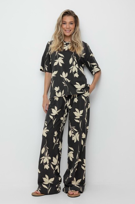 Брюки прямого свободного кроя с боковыми карманами из набивного трикотажа супрем.