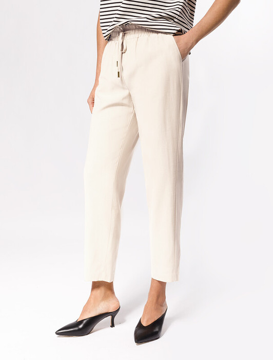 Брюки выполнены из плотного лиоцела. Добавление синтетических волокон в составе изделия предотвращает сминаемость. Эластичный пояс на резинке с регулируемым шнуром комфортно фиксирует изделие не сковывая движений. Модель дополнена боковыми карманами и металлическим логотипом бренда. Для создания завершенного образа сочетайте в костюме с топом D23.058, блузкой D28.054, D29.238, D29.239 и D29.240