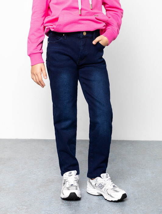 Джинсы mom-fit выполнены из эластичного денима. Внутренняя сторона джинс из мягкого флиса, обеспечит тепло и комфорт на целый день. Есть дополнительная фиксация талии при помощи внутренней резинки. Изделие дополнено высококачественной металлической фурнитурой с логотипом бренда.