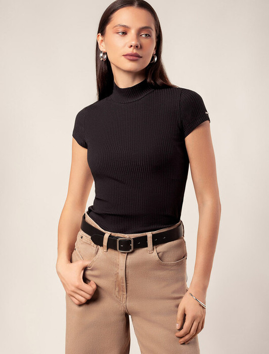 Футболка с воротом стойка выполнена из фактурного трикотажа в рубчик. Модель идеально сидит по фигуре не сковывая движения. Хлопковый трикотаж поддерживает оптимальную температуру тела, поэтому в изделии будет комфортно в течении всего дня. Наличие эластана в составе гарантирует формоустойчивости. Базовая модель впишется в любой гардероб и подойдет для офисного дресс-кода.