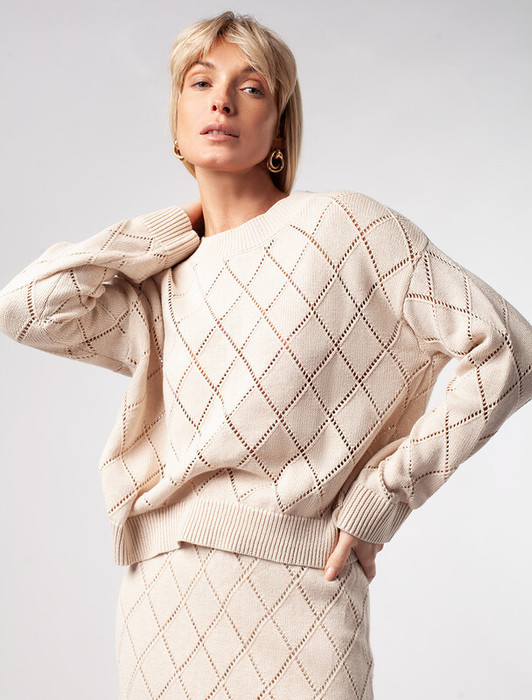 Укороченный джемпер выполнен узорной вязкой из мягкой хлопковой пряжи. Тонкий ажурный трикотаж идеально подходит для теплой весны и лета, в нем будет комфортно и не жарко. Изделие дополнено фирменным логотипом бренда. Сочетается в костюме с юбкой D36.013 и очень хорошо со светлым денимом.