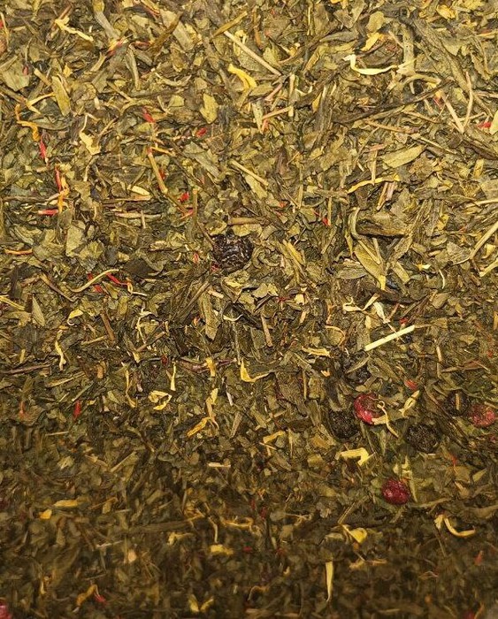 Купаж на основе зелёного индийского чая, вишня, земляника, сафлор, лепестки календулы, шиповник.