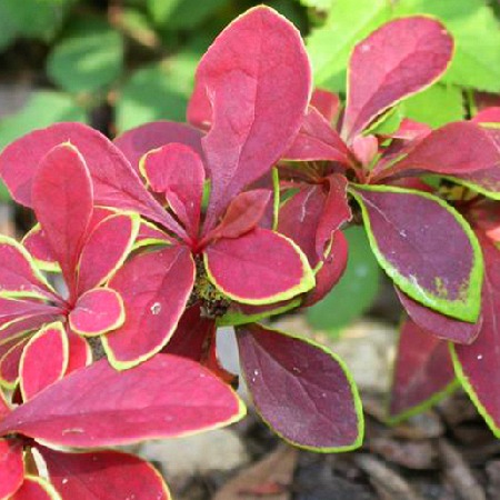 Невысокий раскидистый кустарник. Листья от бордового с зелёной каймой, до розового с жёлтой каймой. Цветёт в мае жёлтыми цветками.
