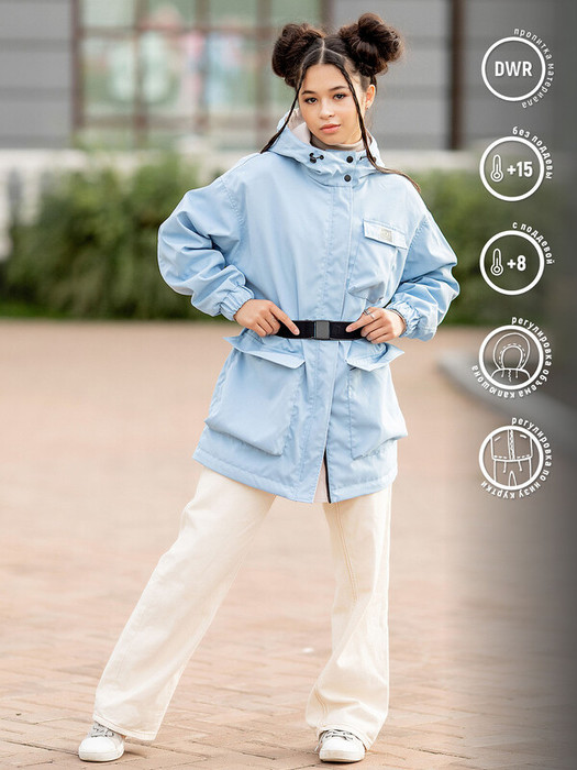 Парка-ветровка для девочки Валенсия в нежной голубой расцветке. Стильная парка без утеплителя фасона оверсайз с приспущенной линией проймы. Центральная застёжка на молнию с внешней ветрозащитной планкой. Низ рукавов на эластичной резинке. Спереди два накладных кармана с листочкой. Особенности: Регулируемый втачной капюшонВоротник на кнопкахОбъёмные накладные карманы с клапаном на магнитеУтяжка талии эластичным ремнем на магнитной пряжкеНаклонный объёмный карман на левой полочкеОтлетная кокетка по спинкеУтяжка низаСветоотражающие термотрансферы Характеристики:Ткань верха: курточная ткань, хлопок с водоотталкивающей пропиткой Подклад: хлопокУтеплитель: нет Температурный режим от +8 (с поддевой) до +15 С (без поддевы)Производитель: batik
